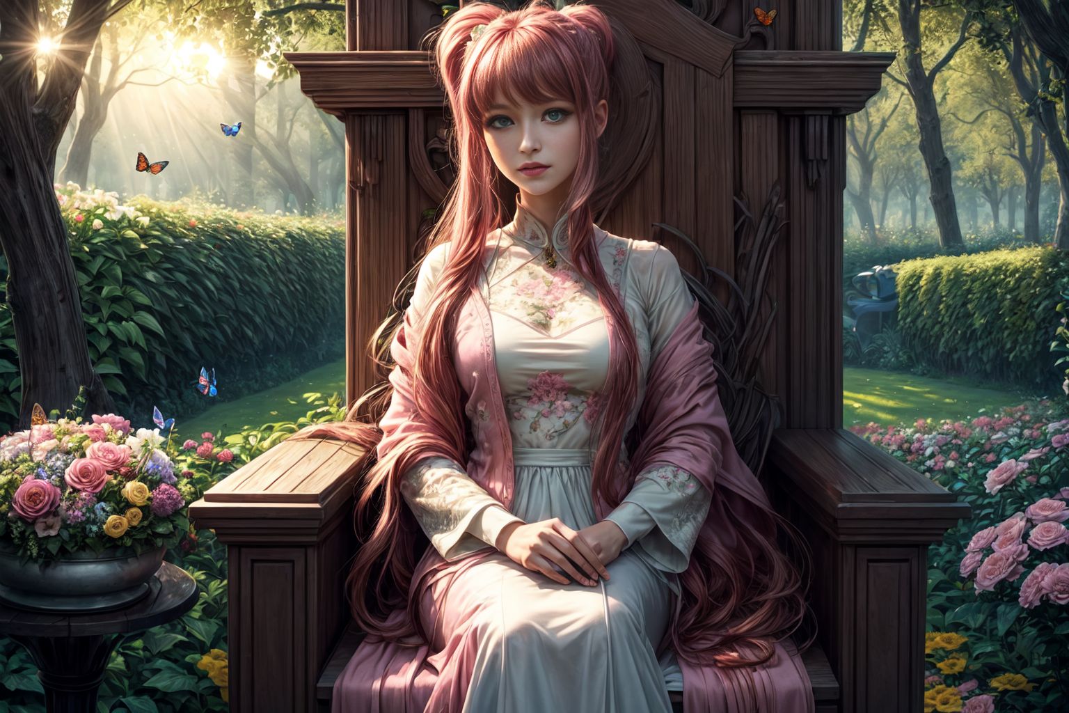 (masterpiece, best quality, 8K, detailed, photo predominance of soft pink colors, close to camera), an extremely delicate and beautiful, (Monika, green eyes, very long hair, ponytail, soft smile, modern clothes, ((throne, garden, flowers, trees, sun, butterflies))), <lora:DetailEnhancer:0.8>, <lora:DDLC:0.7>