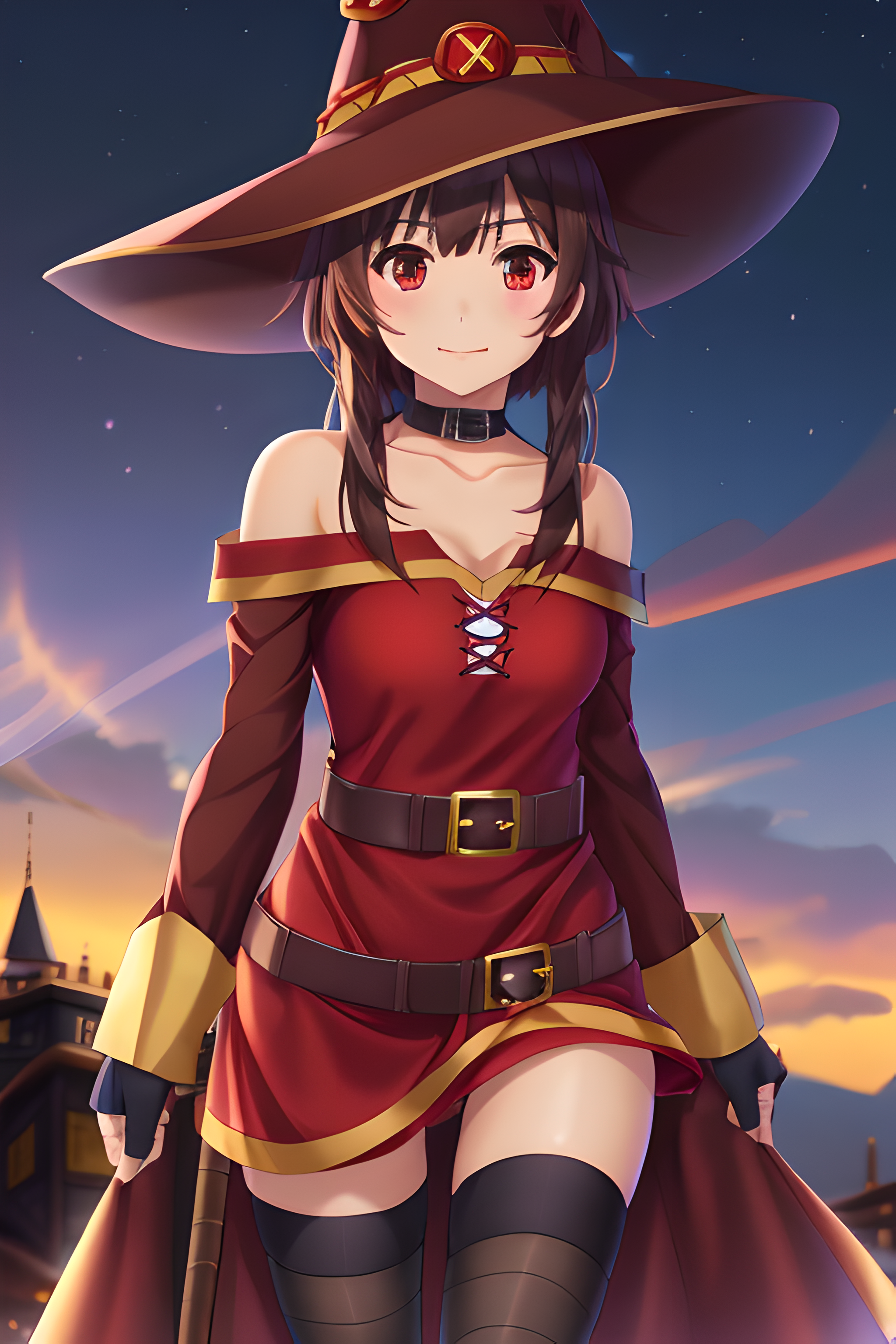 megumin, kono subarashii sekai ni shukufuku wo!, 1girl, solo, standing, looking at viewer, hat, witch hat, brown hair, short hair with long locks, red eyes, blush, evil grin, black choker, collarbone, flat chest, off-shoulder dress, dress, red dress, brown cape, long sleeves, black gloves, fingerless gloves, belt, brown belt, gold trim, zettai ryouiki, skindentation, (asymmetrical legwear:1.4), mismatched legwear, (bandaged leg:1.3), black thighhighs, (arms behind back:1.3), mature, mature woman, boobs, big boobs <lora:Megumin:0.6>