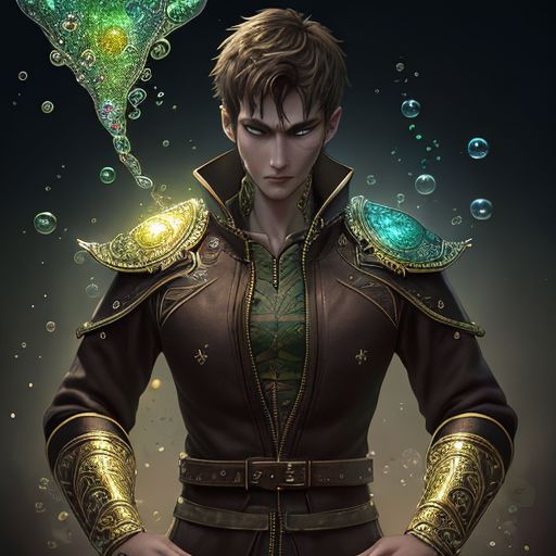 Warrior, slender, tall man, a man who is able to control dragons, has special abilities and can use Dragon Cries. A fearless warrior with brown hair and dark green eyes. He is endowed with strength and agility bestowed upon him by the ancient spirits of subspace. Garrett wears a jacket decorated with gold patterns and zips up, which radiates a magical glow. extremely detailed intricate beautiful fantastic high definition view many rainbow bubbles very attractive very cute