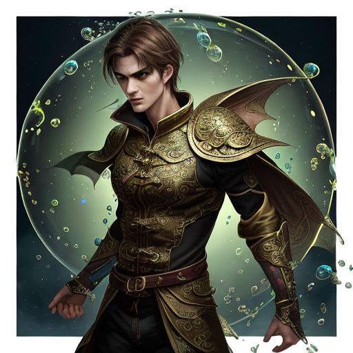 Warrior, slender, tall man, a man who is able to control dragons, has special abilities and can use Dragon Cries. A fearless warrior with brown hair and dark green eyes. He is endowed with strength and agility bestowed upon him by the ancient spirits of subspace. Garrett wears a jacket decorated with gold patterns and zips up, which radiates a magical glow. extremely detailed intricate beautiful fantastic high definition view many rainbow bubbles very attractive very cute