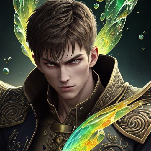 Warrior, slender, tall man, a man who is able to control dragons, has special abilities and can use Dragon Cries. A fearless warrior with brown hair and dark green eyes. He is endowed with strength and agility bestowed upon him by the ancient spirits of subspace. Garrett wears a jacket decorated with gold patterns and zips up, which radiates a magical glow. extremely detailed intricate beautiful fantastic high definition view many rainbow bubbles very attractive very cute