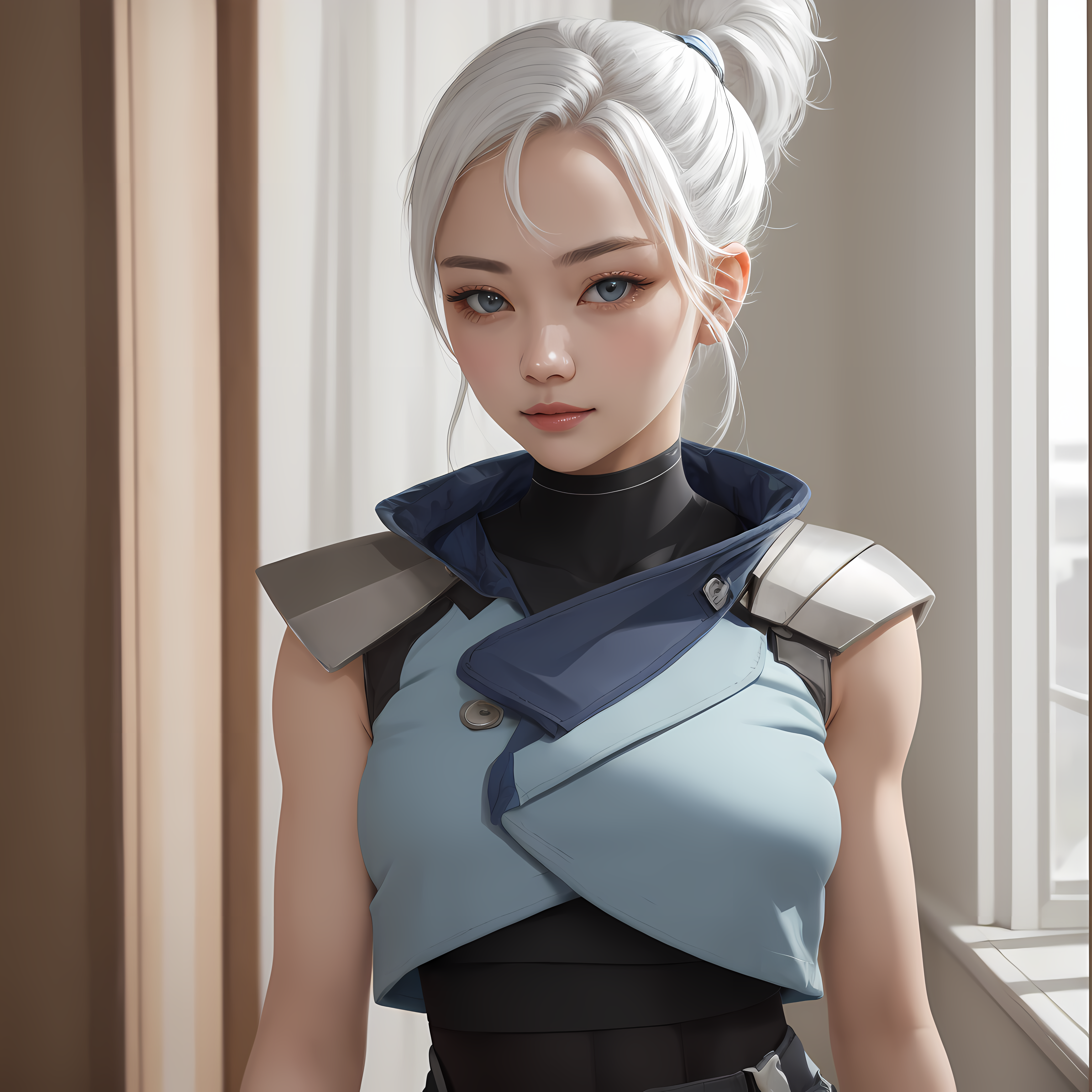 masterpiece, best quality, intricate, high detail, sharp focus, 1girl,<lora:Jett-05:1>, Jett, black gloves, shoulder pads, black pants, cropped sleeveless jacket, white hair, mature woman, blue eyes, ((white ponytail)), looking at viewer, soft smile