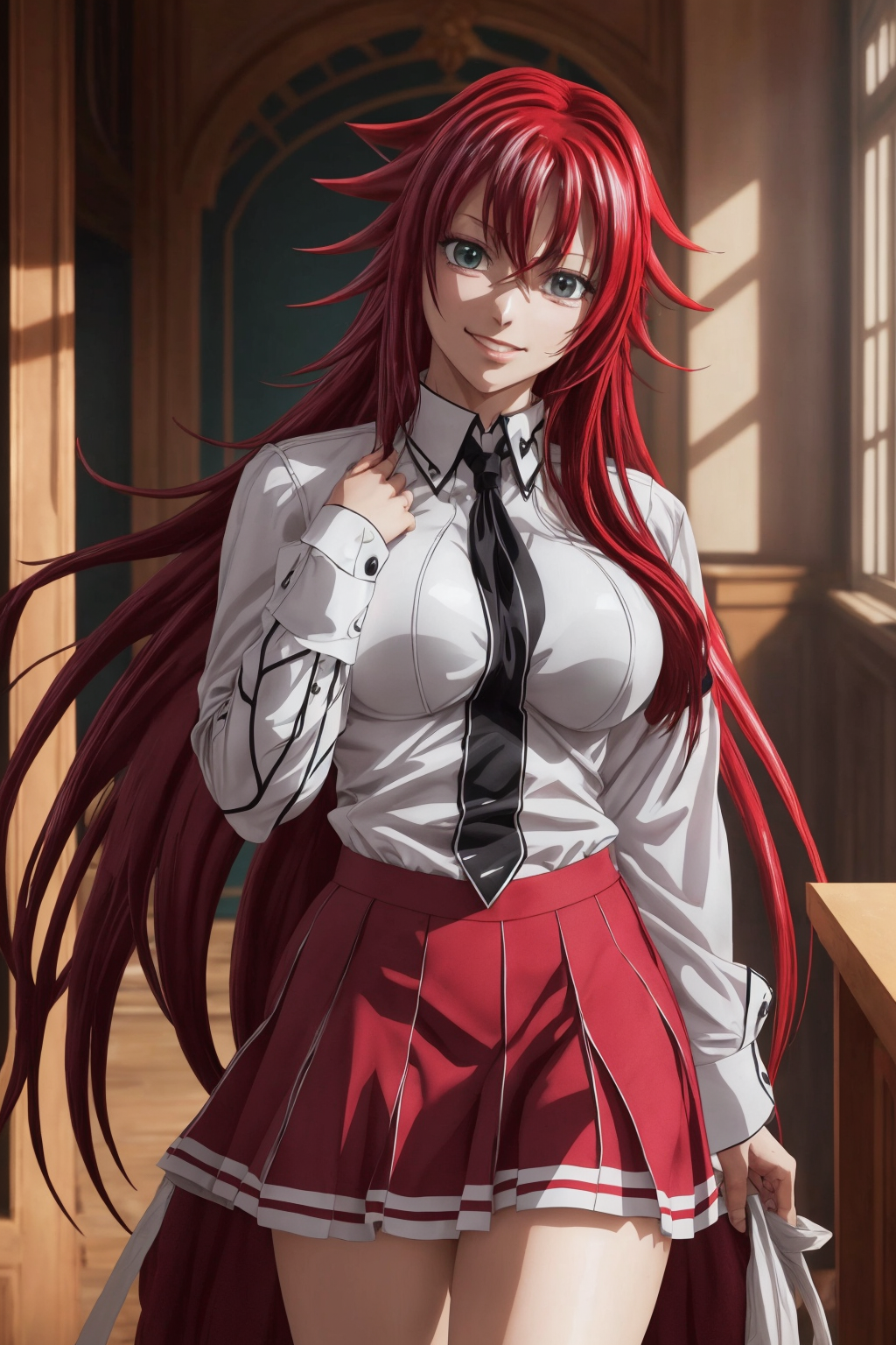 full body solo photograph of (Rias Gremory:1.5), <lora:OGT_Rias_Gremory-v1:0.7>, || green eyes, (very long hair:1.2), hair between eyes, (red hair:1.5), ((school uniform), skirt, white shirt), cute smile, very large breasts, looking at camera, crystal clear, 8K UHD, highly detailed, glossy eyes, high detailed skin, skin pores, <lora:add_detail:0.5>