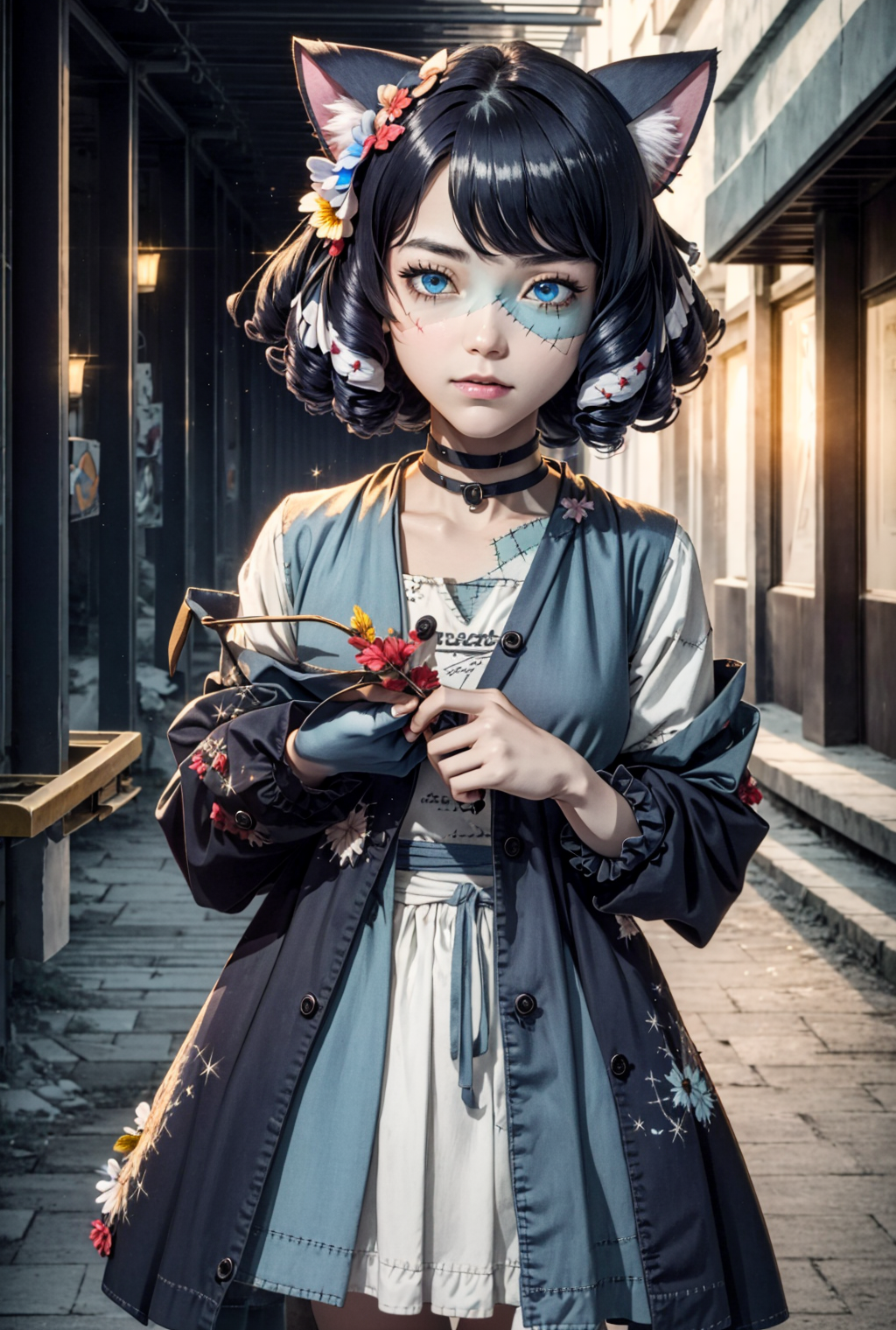 zombiegirl,colored skin,stitches,patchwork body, <lora:Ðомби-девоÑка(zombiegirl,colored skin,stitches,patchwork body):1>, <lora:ÐоÑка-девоÑка из Ñок ÑоÑ(cyan, animal ears, cat ears,tail,blue eyes,black hair,curly hair):0.7>, cyan, animal ears, cat ears,tail,blue eyes,black hair,curly hair, 1girl in full growth, best quality, masterpiece, ultra-detailed, high quality, perfect nose, highly detailed skin, warm skin tone, defiance512, RAW photo, best quality, high resolution, (masterpiece), dreamlike, dreamy, modelshoot style, analog style, tonemapping, photorealistic, professional photography, sharp focus, HDR, 8K resolution, intricate detail, sophisticated detail, hyper detailed, (depth of field), highlight and shadow, volumetric lighting, cinematic bloom, professional light, looking at viewer, blotchy,