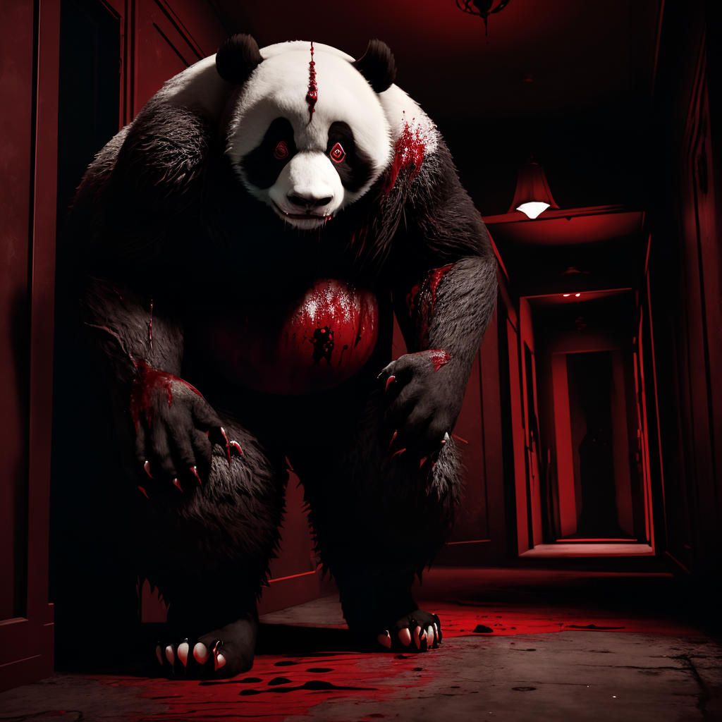 monstrous panda, covered in blood, drooling, bloody paws, blood,red eyes, horror, dark room, old corridor, haunted house, high contrast, moody, (darkness, dark: 1.5), shadows, blood, night, octane render, unreal engine,