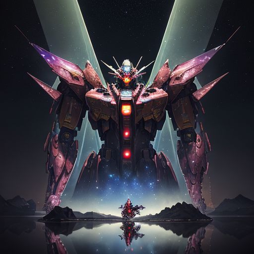 Cute watercolour fantasy illustration by Brian Kesinger, aesthetic, photorealistic, Digital Painting, very detailed high resolution, Studio Ghibli, Anime Key Visual, by Makoto Shinkai, Deep Color, Intricate, 8k resolution concept art, Natural Lighting, Beautiful Composition", Broken Glass effect, no background, stunning, something that even doesn't exist, mythical being, energy, molecular, textures, iridescent and luminescent scales, breathtaking beauty, pure perfection, divine presence, unforgettable, impressive, breathtaking beauty, Volumetric light, auras, rays, vivid colors reflects (red and black mecha), gundam, holding rifle, explosion, laser, robot, masterpiece,best quality,ultra-detailed,very detailed illustrations,extremely detailed,intricate details,highres,super complex details,extremely detailed,cowboy shot, caustics,reflection,ray tracing,demontheme,nebula,dark aura,cyber effect, action, ancient japanese architecture,pond, starry sky,skyline, <lora:mecha_offset:1> <lora:more_details:0.2>