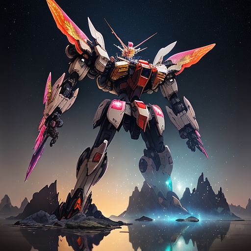 Cute watercolour fantasy illustration by Brian Kesinger, aesthetic, photorealistic, Digital Painting, very detailed high resolution, Studio Ghibli, Anime Key Visual, by Makoto Shinkai, Deep Color, Intricate, 8k resolution concept art, Natural Lighting, Beautiful Composition", Broken Glass effect, no background, stunning, something that even doesn't exist, mythical being, energy, molecular, textures, iridescent and luminescent scales, breathtaking beauty, pure perfection, divine presence, unforgettable, impressive, breathtaking beauty, Volumetric light, auras, rays, vivid colors reflects (red and black mecha), gundam, holding rifle, explosion, laser, robot, masterpiece,best quality,ultra-detailed,very detailed illustrations,extremely detailed,intricate details,highres,super complex details,extremely detailed,cowboy shot, caustics,reflection,ray tracing,demontheme,nebula,dark aura,cyber effect, action, ancient japanese architecture,pond, starry sky,skyline, <lora:mecha_offset:1> <lora:more_details:0.2>