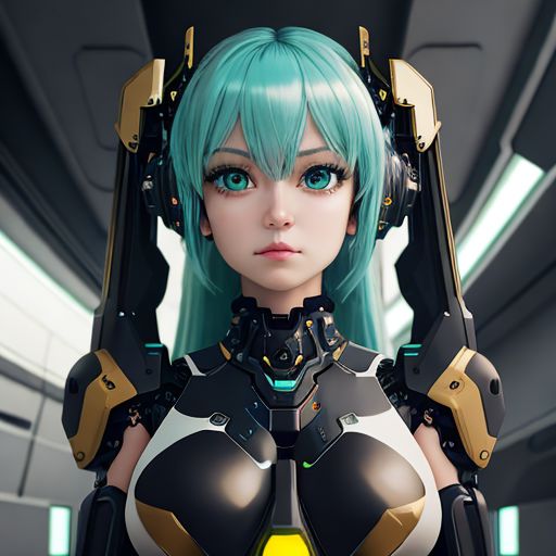 cgmech, beautiful eyes, upper body, underboob, portrait, robot, armor, Hatsune Miku, neon light, 8K, RAW, best quality, masterpiece, ultra high res, colorful, (medium wide shot), (dynamic perspective), sharp focus , (depth of field, bokeh:1.3), extremely detailed eyes and face, beautiful detailed eyes,large breasts,(black gold, trimmed gear:1.2),(In a futuristic weapons factory:1.2), ((masterpiece, best quality)), <lora:more_details:0.3> Detailed background, spaceship interior <lora:Niji:0.5>