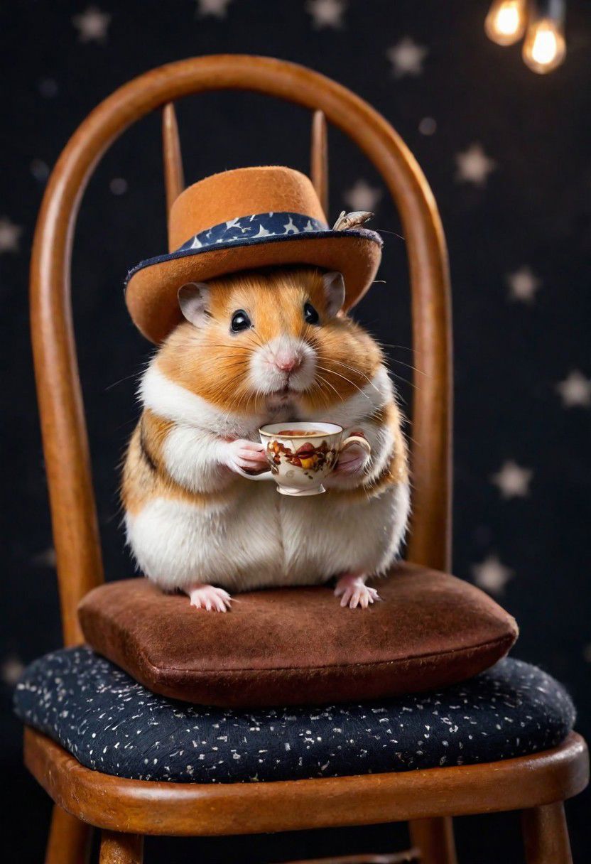Macro Photography, chubby Dzungarian hamster in an adventurer's hat (drinking tea sitting on a chair, watching birds,), Simple background,Dark stars background,Extreme Detail,UHD,8K,Studio Lighting,Professional Photography,fine art