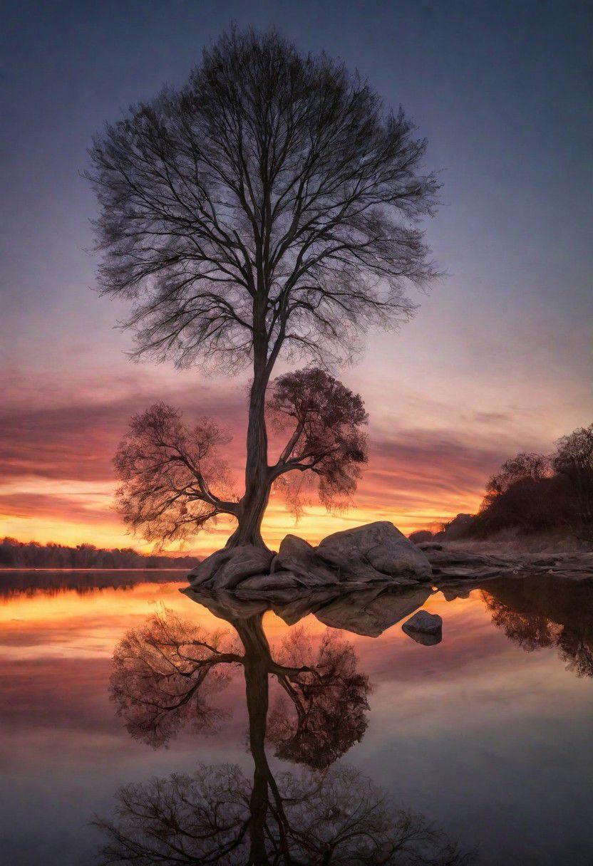a tree sitting on top of a rock next to a body of water, beautiful reflexions, fire reflection, beautiful reflections, awesome greate composition, reflection on the water, setting in nature, incredible reflections, detailed reflection, reflection in the water, mystical setting, reflection, cold sunset, magical tree, reflection in water, warm beautiful scene, mirror reflection