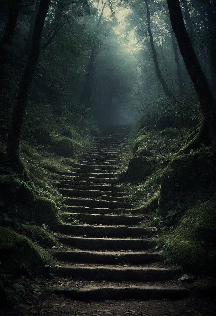 a set of stairs going up a hill in the woods, an ancient path, beautiful and mysterious, mystical scene, dark fantasy setting, stone paths, fantasy setting, stone stairway, stone steps, atmospheric fantasy setting, mysterious and scary forest, by Otakar Kubn, stairs from hell to heaven, old stone steps, by Aleksander Kobzdej