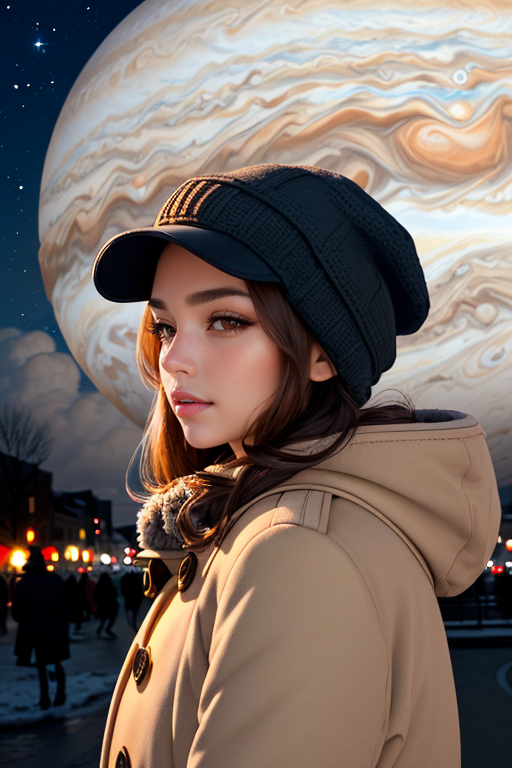 woman, on street, winter outfit, coat, winter cap, portrait view, (planet in sky, at night, jupiter, clouds), <lora:planets:0.7>