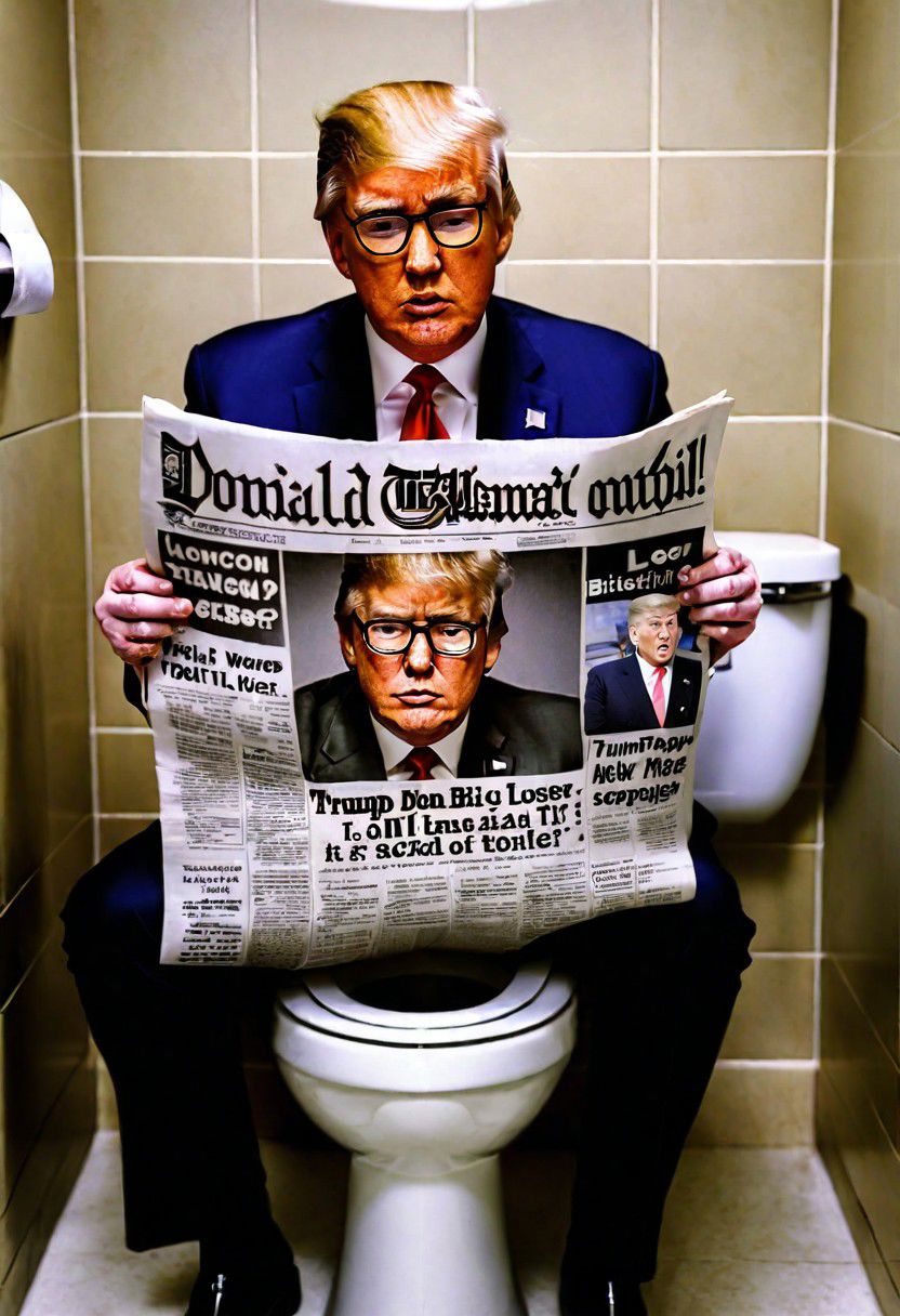 Photo of a Donald Trump, wearing bifocals, sitting on a toilet, reading newspaper, headline "LOSER"