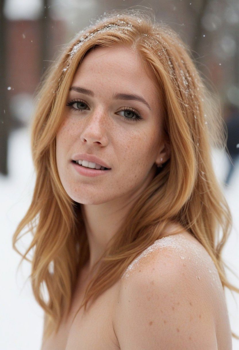 Full-body photograph of a kristin cavallari, snow cap, strawberry blonde hair, natural pubic hair, olive skin, freckles, blush, (topless:1.1), innocent, city, snowfall, Porta 160 color, shot on ARRI ALEXA 65, bokeh, sharp focus on subject, shot by Don McCullin, nsfw