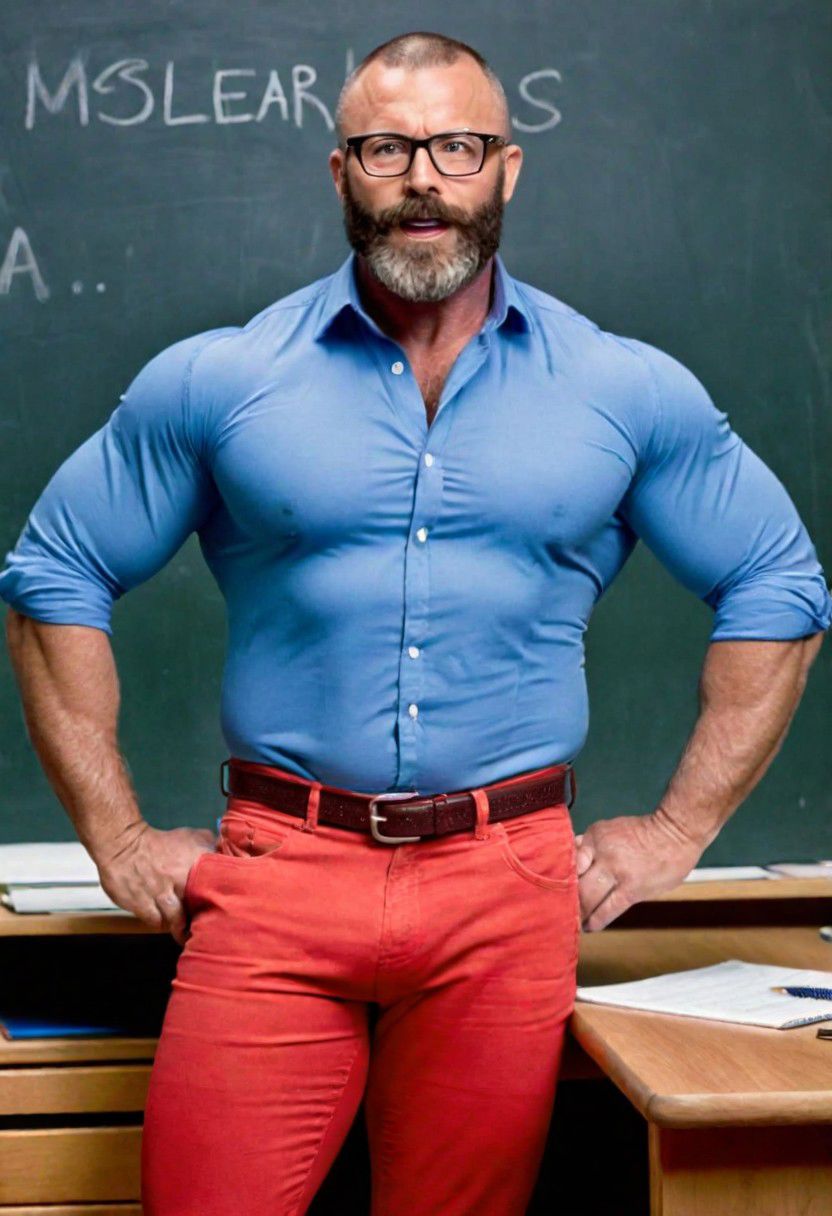 1man, nerdy teacher with thick glasses, mature, (huge, beefy, hot, hairy, musclebear man, manly, wide jaw), blue tight shirt, tight red jeans, huge groin, standing in front on a desk, blackboard, classroom background, blurry background, vibrant colors, film grain, fashion magazine,