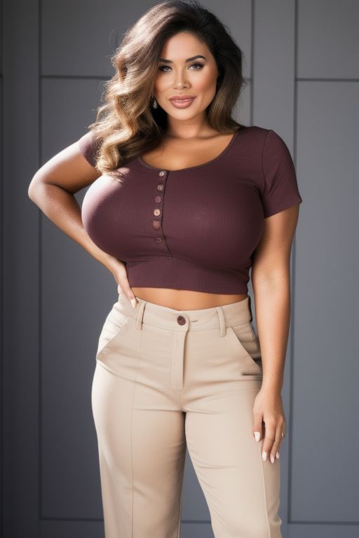 An image of a busty young woman with a medium complexion and chestnut-colored hair styled in a casual updo with loose strands around her face. She has a natural makeup look with defined eyes and a neutral lip color. She is wearing a fitted, cropped burgundy T-shirt with short sleeves and high-waisted black pants with distinctive button details. She stands confidently, with one hand on her hip and the other gently touching her pants. The lighting is soft and frontal, highlighting her features and the texture of her clothing against a muted dark background.
