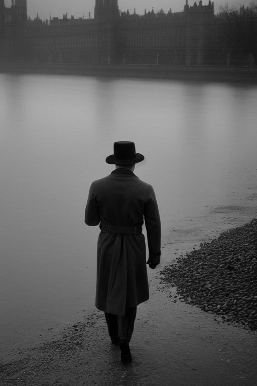 EasyNegativeV2: Vintage film's still, with a grainy texture, showcasing Sherlock Holmes wearing his trademark coat and deerstalker hat, strolling along the misty banks of the River Thames, his trusty pipe clenched between his teeth, the murky waters reflecting the enigmatic atmosphere of Victorian-era London.