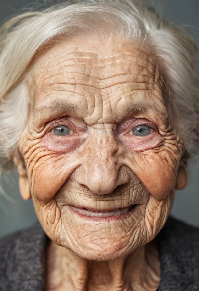beautiful portrait of a gorgeous 110 years old, wrinkled skin, happy caucasian woman.