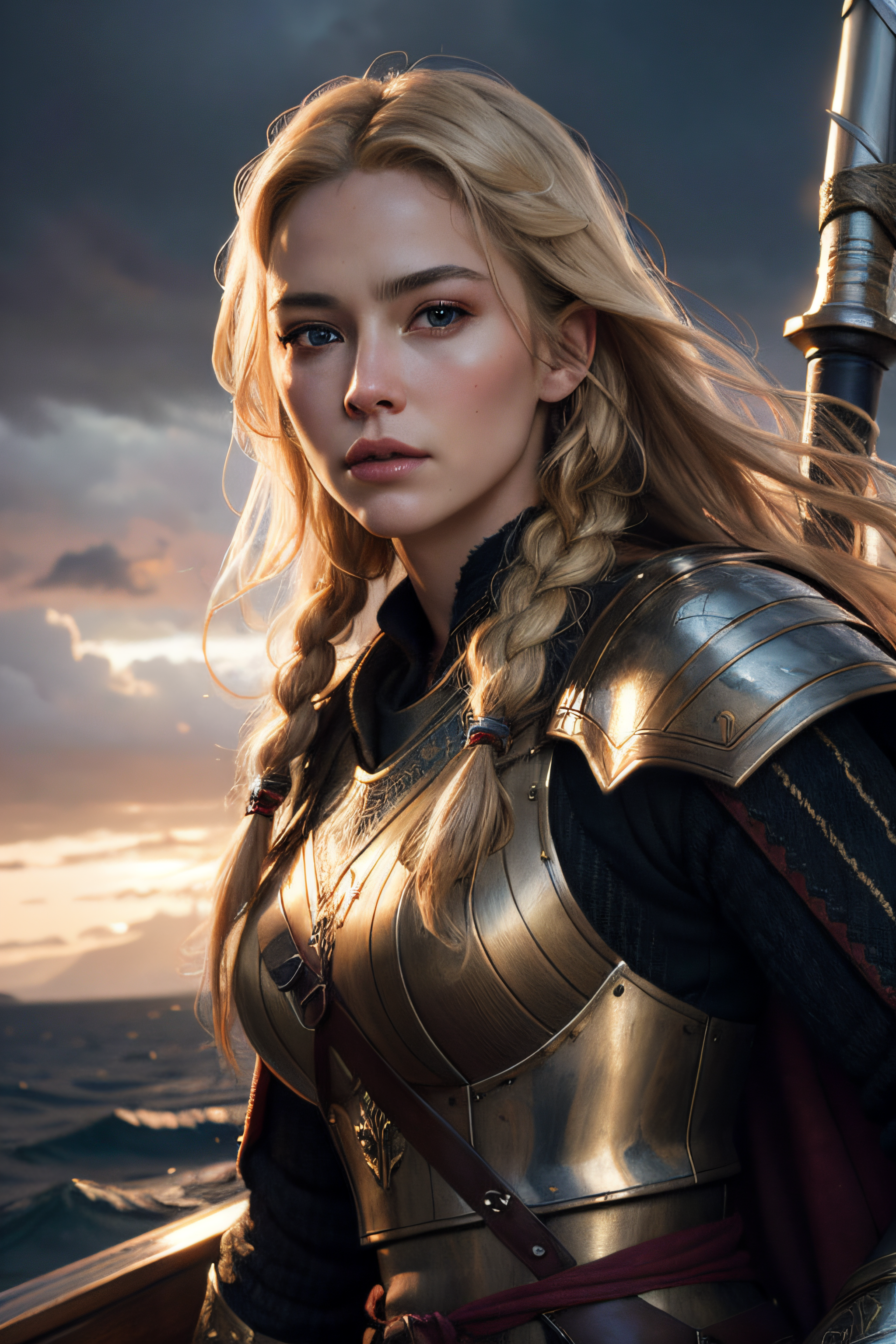 highres, extremely detailed, 8k photo, best quality, beautiful lighting, intricate details, realistic, detailed face and eyes, Norse battle woman, face focus, long flowing blond braids waving in a strong wind, holding a long sword, high waves, storm, on the bow of a large Viking ship, full lips photorealistic, photo, masterpiece, realistic, realism, photorealism, trending on Artstation 8k HD high definition detailed realistic, detailed, skin texture, hyper detailed, realistic skin texture, armature, best quality, ultra high res, high resolution, detailed, raw photo, sharp re, rich colors hyper realistic lifelike texture dramatic lighting unrealengine trending on artstation
