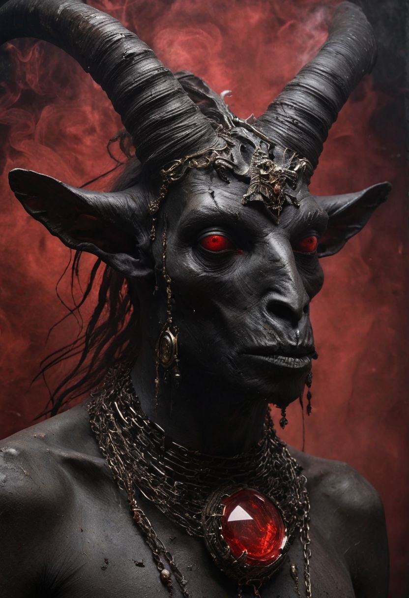 masterful sculpture composition in the style of Kris Kuksi, grotesque, oil on canvas, Baphomet, very old and grunge goat face, he is looking up, he wears necklaces and earings, he wears ancient evil clothes, black coal skin texture, oiled skin surface, infernal lighting, at hell, top light, ethereal hot light, chiaroscuro, fog, mist, red smoke