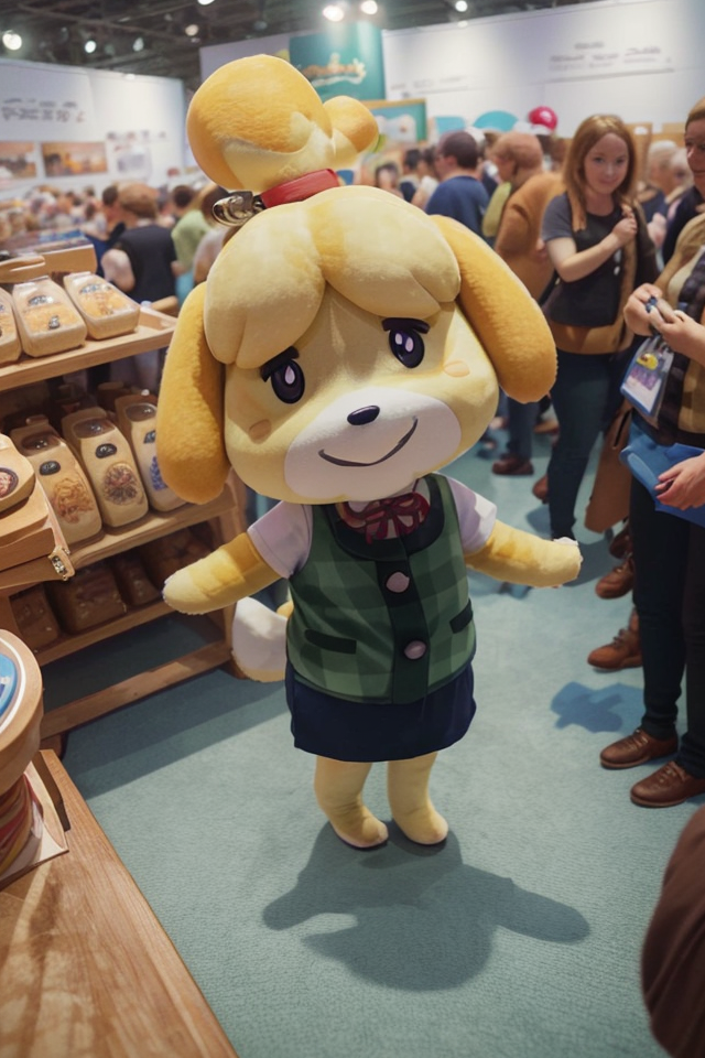 (8k, best quality, masterpiece:1.2), (realistic, photo-realistic:1.4), ultra-detailed, isabelle \(animal crossing\), dog girl, exhibition companionsmile, topknot, animal ears, furry, happy scene, <lora:shizue_Isabelle:1> fisheye lens, exhibition hall crowded with people