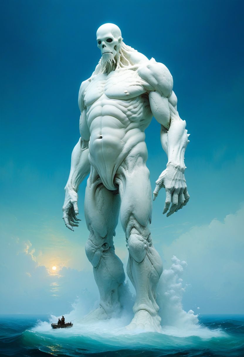 high resolution photo of a gargantuan monstrous creature, white, peculiar, by Ivan Aivazovsky, Antony Gormley, by Ken Kelly, (professional, finest details, masterpiece, best quality:1.5), Teal Blue hue, highly dramatic volumetric lighting <lora:xl_more_art-full_v1:0.5>