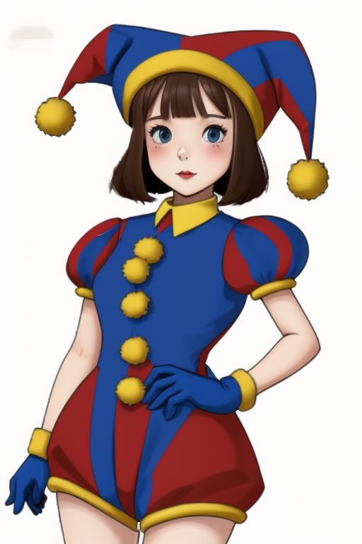pomni,brown hair,jester hat,clown hat,symbol-shaped eyes,short hair,thighhighs,puffy sleeves,short sleeves,gloves