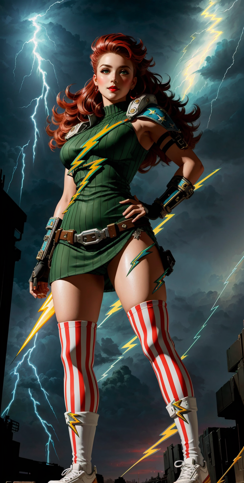 Irish, Masterpiece, (1990s [cyberpunk|elfpunk|sci-fi] art), beautiful lighting, (modelshoot style), (from_bellow:1.3), (a character portrait:1.1), art by artgerm and greg rutkowski and magali villeneuve, analog style, (best hands:1.2), (full body shot:1.2), (Irish woman:1.4), (red hair:1.2), (long green dress:1.4), (red and white striped Knee High Socks:1.5), red converse sneakers, punk jean jacket, her arms outstretched, fingerless bridal gloves, wide hips, hourglass figure, huge boobs, (lightning bolts arcing around body:1.4), (abstract painting background:1.4), Ella Guru, character art, concept art, (art by alex ross:1.4), Altichiero, comic cover art, concept art, afrofuturism, realistic character concept, realism, character design, concept art, character portrait, masterpiece, detailed face, painting by Ed Blinkey, Atey Ghailan, Studio Ghibli, by Jeremy Mann, Greg Manchess, Antonio Moro, alphonse mucha, trending on ArtStation, trending on CGSociety, Intricate, High Detail, Sharp focus, dramatic, photorealistic painting art by midjourney and greg rutkowski, (3d, unreal engine:1.2), front view, vivid details, (Art by Frank Frazetta and Jeff Easley), cyberpunk artwork, akira, oil on canvas, (perfect composition), vivid colors, intricately detailed, fine details, (full body:1.1)