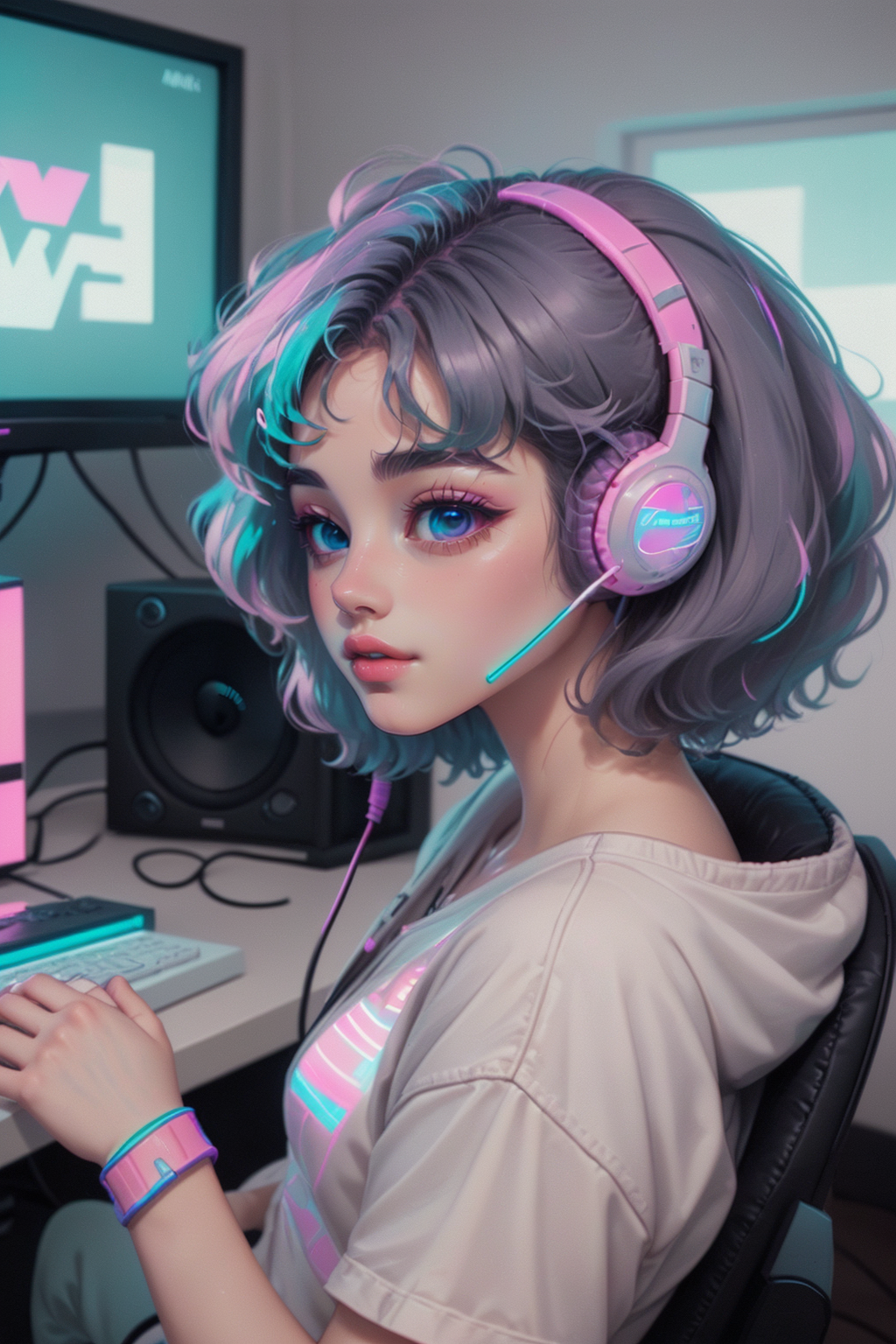 cutecore vaporwave style, a woman listening to music in her room, headset, gaming chair <lora:Cutecore_Vaporwave:1.0>