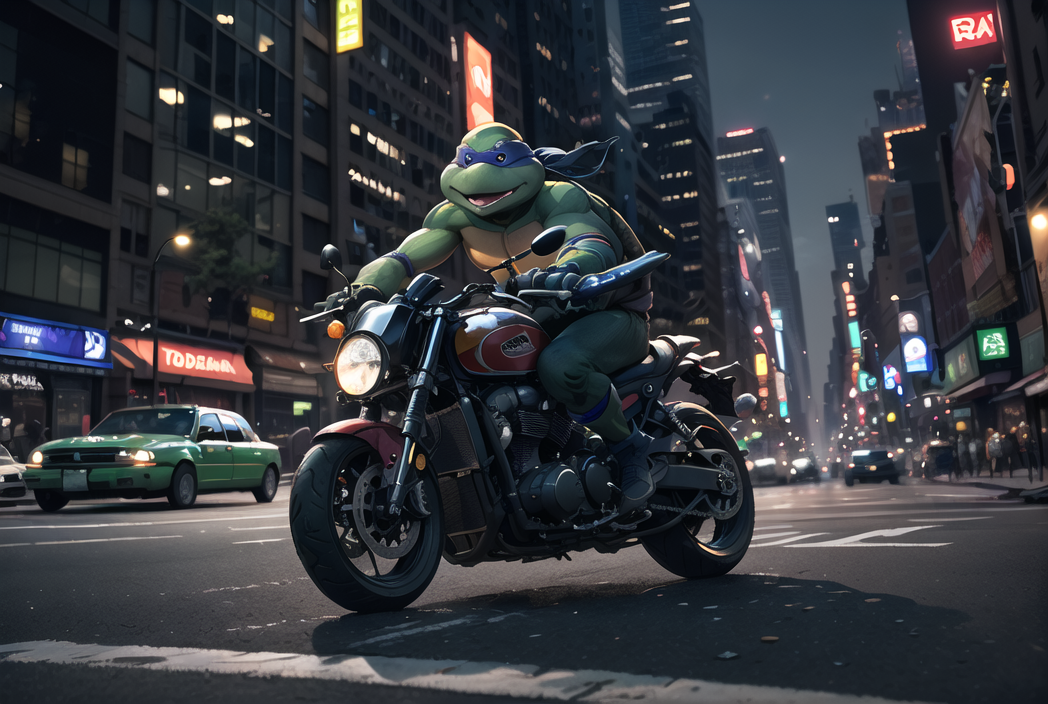 masterpiece,best quality,dramatic shot depth of field,panavision look,film anamorphic look,movie still,HD,photography,1robber,1TMNT,<lora:TMNTSaturdayMorningAdventures:1>,this photo is a story of TMNT chasing the robber in new york city,the robber driving a motorcycle fast,TMNT behind the robber,RAW photo,city lights at night,