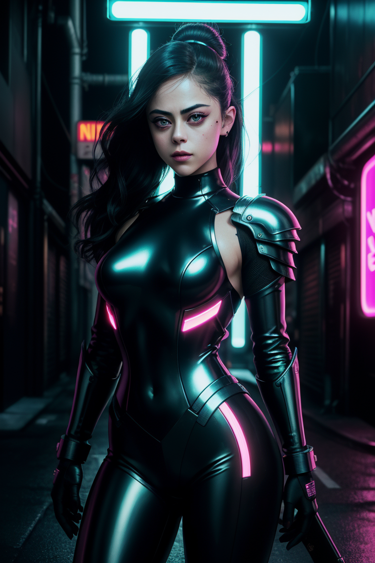 photo of seductive (Ros4S4l4z4r:0.99), a woman as a sexy cyborg, closeup portrait, (80s hairstyle), (cyberpunk black metallic liquid armor), in an (80s style) noir movie, (dangerous alley:1.1), (arm cannon:1.1), (masterpiece photorealistic painting:1.1) (bokeh) (best quality) (detailed skin texture pores hairs:1.1) (intricate) (8k) (HDR) (wallpaper) (cinematic lighting) (sharp focus), (big eyes), (cinematic atmosphere), (neon signs)