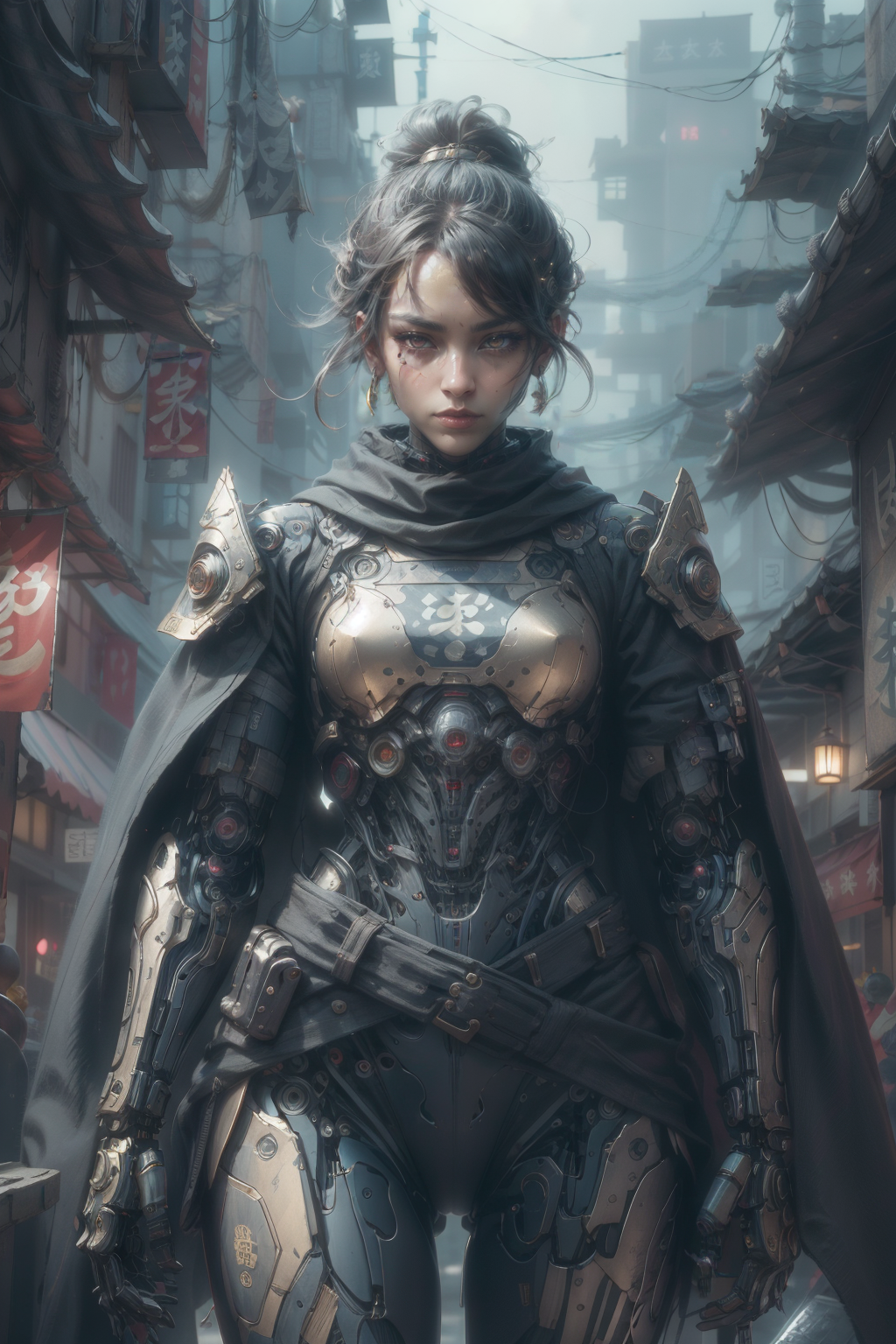 (A woman in armor,Perfect face,Delicate face,Delicate makeup),(Delicate mechanical eye prosthesis(Glowing gold eyes)), ((Masterpiece, best quality,edgQuality)),extremely high detailed, intricate, 8k, HDR, edgBerserker,woman ,wearing edgBerserker_armor,,shoulder armor,torn cape, Fine armor(art,Reflective armor,Reflective materia,Black ceramics), SAMURAI ,cyborg, SMOOTH,SCIFI, <lora:ShinobiTech-20:0.7> ,SHINOBITECH,SCIFI,SHINOBI,BULKY METAL,CYBERPUNK,NEON LIGHTS, <lora:Samuraibot:0.6>, <lora:more_details:0.5> ,<lora:æ³å :0.5>,