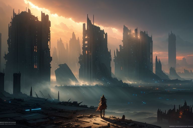 masterpiece, highest quality, HDR, 4K, UHD, digital painting, post apocalyptic scene, celestial lighting , unreal engine, octane render, fantasy, dreamy, brutalist environment, long shot, urban wasteland, looking out over the sea, sole survivor standing on the shore of a devastated city in ruins, fire, chaos, sun setting on a destroyed world, tragedy, art by borris vallejo, (ethereal fantasy concept art), epic, majestic, magical, fantasy art, cover art, best quality, (Fantasy Art), moody