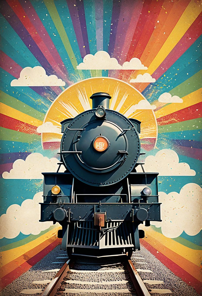 Bold, retro-style poster, cheerful sun with a beaming grin and stylized rays, vintage locomotive transformed into a train, curved rainbow track, bursting glitter trail, stylized clouds, playful typography, limited color palette, textured background, nostalgic feel