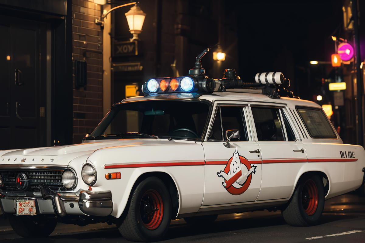 front view, ghostbuster, ghostbusters uniform, ghostbusters car, New York street alley, night city lighting, close car, ghostbusters emblem, Ecto-1, White rims <lora:Oil_Painting_Feel:1>