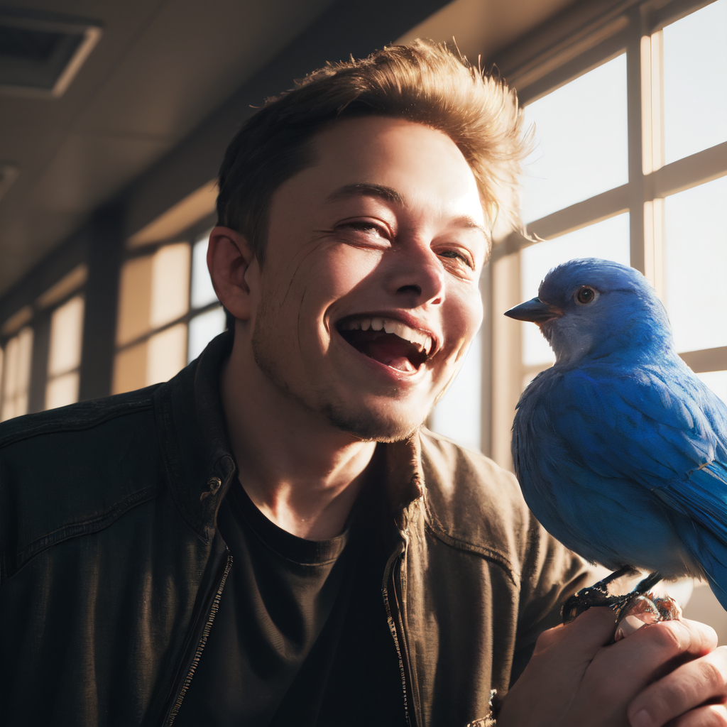 a man (elon musk) evil laughing, chasing a bird,(blue bird), official art,finely detail, Depth of field,(((masterpiece))),((extremely detailed CG unity 8k wallpaper)),best quality, high resolution illustration,Amazing,highres,intricate detail,(best illumination, best shadow, an extremely delicate and beautiful),, <lora:SLS:1.0>,