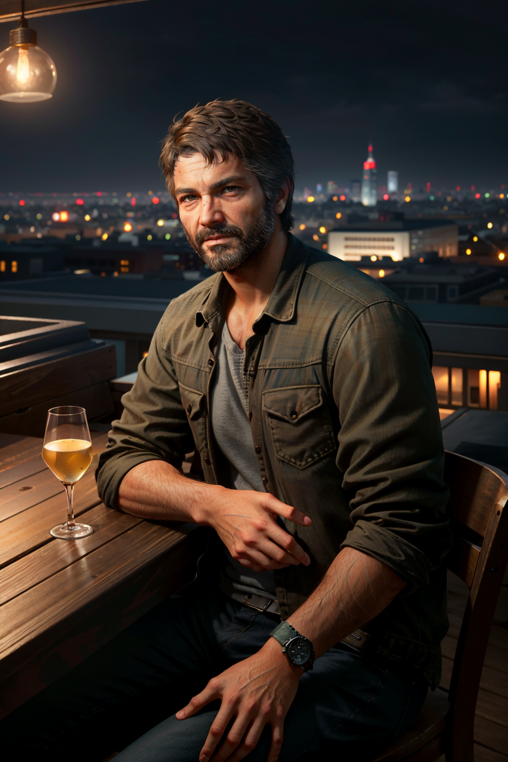 ((masterpiece, best quality)) <lora:TLOUJoel:0.8> TLOUJoel, 1boy, solo, brown hair, brown eyes, beard, at a high-end rooftop bar, sipping a martini while gazing at the stunning city skyline at night