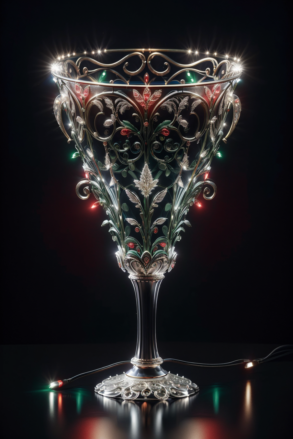 masterpiece, best quality, <lora:reindeerlights-nvwls-v1:1> reindeerlights chalice, still life, black background, red lights