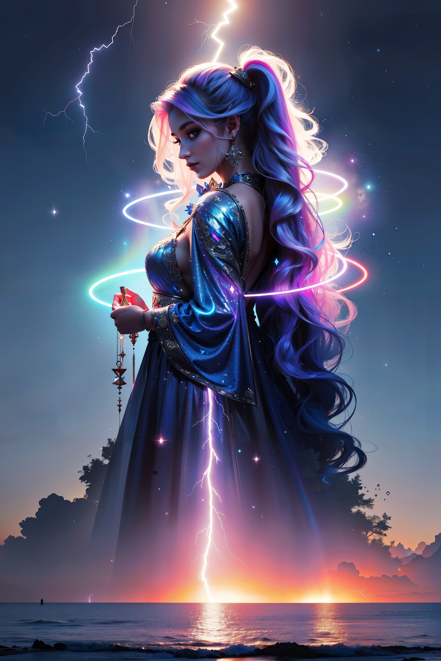 ((masterpiece:1.3,best quality)),<lora:wrenchsfantasy:0.8>,<lora:detail_slider_v4:0.8>,wrenchsfantasy,fantasy,glowing,glowing eyes,detailed face,ultra high quality,8k wallpaper,(from side), young 18 year old girl in a magic city,fantasy, feets are in the water, (cute posing:1.3), rainbow straight hair with brided twin tails,very long hair, (magic lightning on the left hand:1.3), ranbow sparkles,galaxies in the nightsky<lora:DetailedEyes_V3:1.0><lora:DetailedEyes_V3:1.0>