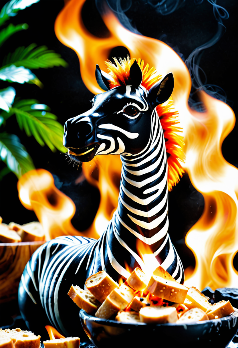score_9, score_8_up, score_7_up,surrounded by fire,sfw,(raw,bimbo makeup,source_western,Vaporizer,ponytail,photo realism, Masterpiece, (8k), (32k), UHD, highest-quality, intricate details,alluring,bowl of black marble,loaf of bread in background blurry. the zebra has a hand-crafted look, <lora:add-detail-xl:0.75>