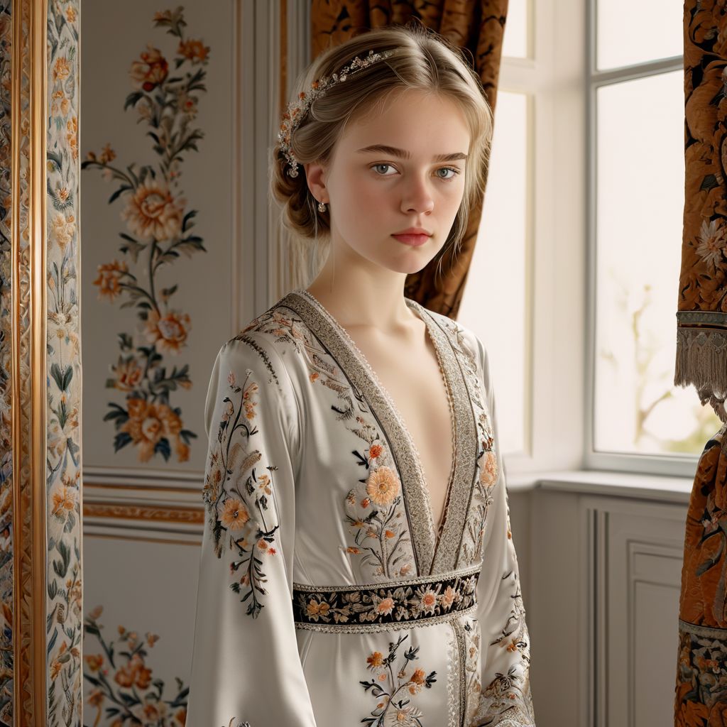 (1girl) stunning realistic detailed provocative candid full-body photo of a stunningly pretty German princess, age 18, she wears elegant embroidered robes, she is tremendously courageous and intelligent, she looks at the viewer seductively,