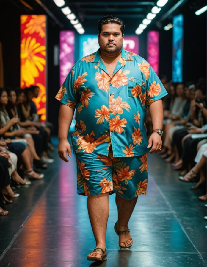 masterpiece, stunning, award winning, absurdres, 8k, focused, highly detailed, vivid color, high contrast, sharp details, ((photograph)) (Cyberpunk aesthetic) (taken with a Yashica T4 Camera) (medium shot:0.5), ((full body, portrait)), (profile:0.25), ((subject in focus)), (beautiful detailed face), (symmetrical face), of: a (middle-aged), morbidly obese indo-aryan man strutting on a ((fashion runway)) with a smug, confident expression, wearing hawaiian shirt <lora:StS_age_slider_v1_initial_release:-1> <lora:cybepunk:0.5> <lora:EnvyZoomSliderXL01:-1> <lora:add-detail-xl:3>