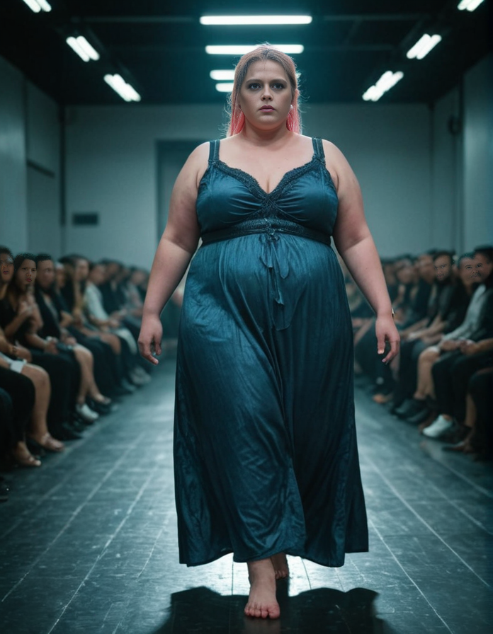 masterpiece, stunning, award winning, absurdres, 8k, focused, highly detailed, vivid color, high contrast, sharp details, ((photograph)) (Cyberpunk aesthetic) (taken with a Olympus XA2 Camera) (medium shot:0.5), ((full body, portrait)), (profile:0.25), ((subject in focus)), (beautiful detailed face), (symmetrical face), of: a (middle-aged), morbidly obese european trans-female strutting on a ((fashion runway)) with a smug, confident expression, wearing nightdress <lora:StS_age_slider_v1_initial_release:-1> <lora:cybepunk:0.5> <lora:EnvyZoomSliderXL01:-1> <lora:add-detail-xl:3> <lora:sss:1>