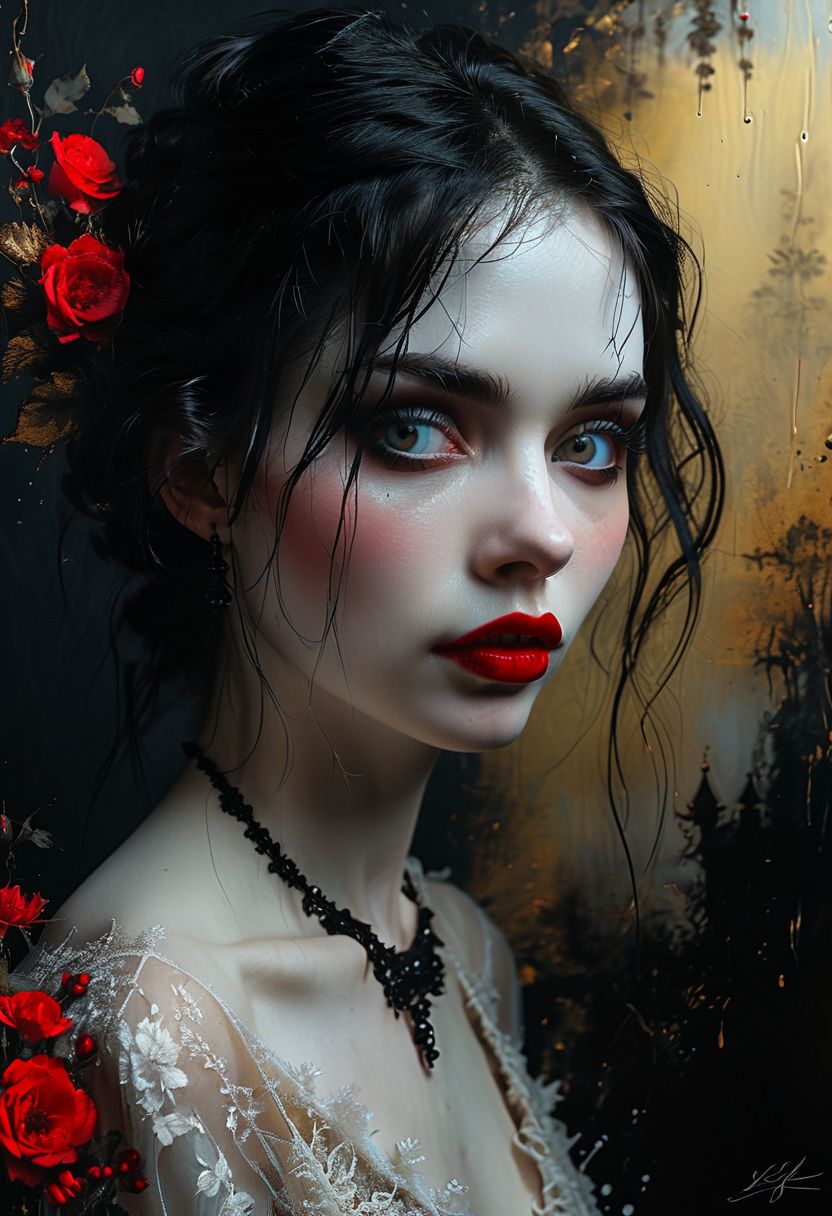 (masterpiece, best quality, hyper detailed, ultra realistic, 32k, RAW photo) watercolor, ink mix, Full shot of a, (in the style of Claude Monet), skinny gothic woman Positive Clip G style, watercolor, ink mix, Full shot of a, an award-winning photography, an impressive Full shot of the face of a skinny Gothic woman that captivates the viewer. Her pale, porcelain-like skin appears almost supernatural, while her dark eyes exude depth and penetration. The fine details of her face are accentuated by the interplay of light and shadow, highlighting her distinctive features. The dark lips lend a mysterious sensuality to her expression. This close-up captures the intensity and captivating allure of Gothic aesthetics in a single moment, <lora:MJ52:0.5>, perfect composition and chiaroscuro by Rembrandt, concept art, by Jarek Kubicki, by Raphael Lacoste, John Pitre, Karine Eibatova, by Ralph Blakelock, by Julie Bell, by Jim Warren, by Aleksey Savrasov, <lora:Desolation:0.3>