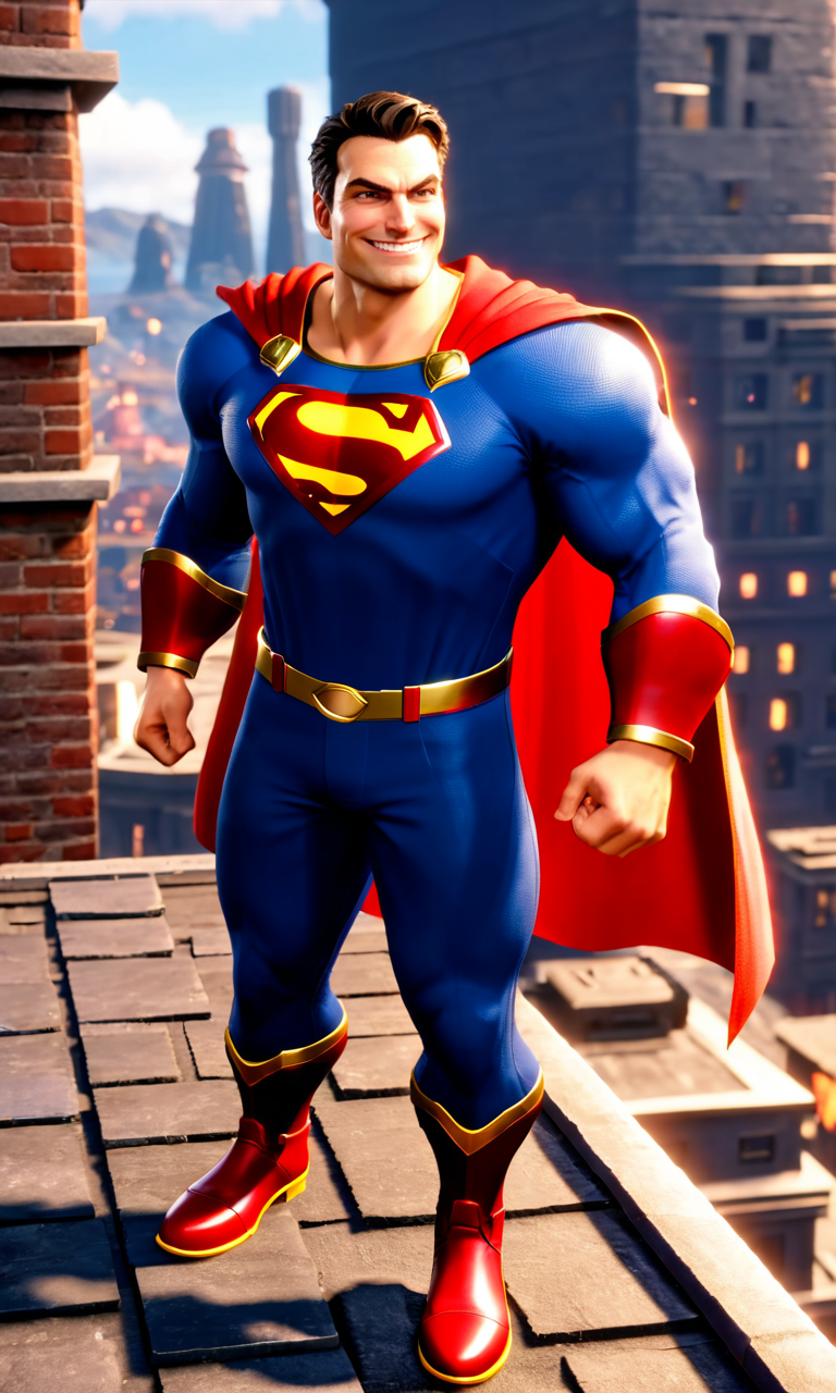superman standing on a roof, best quality, looking at viewer, <lora:sf6sdxl:1>, sf6sdxl, game cg, cape, smile,