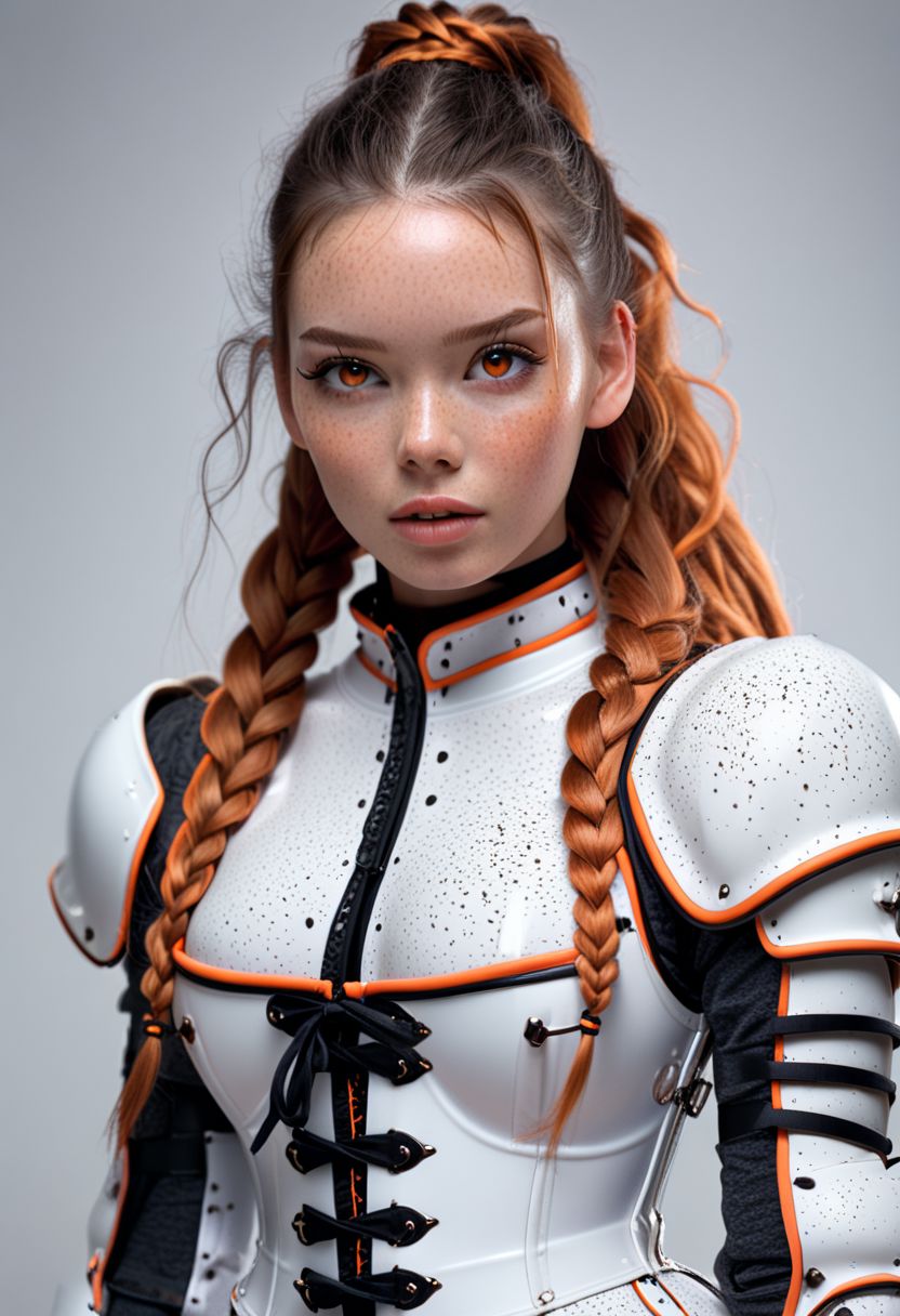 score_9, score_8_up, score_7_up, score_6_up, score_5_up, score_4_up, 1woman, , RAW photo, (freckles:0.8), long braided top ponytail, Brunette hair with orange tips, medium close-up shot front view, White latex corset (busty 44d:1.5), extremely detailed, beautiful detailed neon orange speckled eyes, full lips, almond skin, neutral expression, neutral gray background, studio lighting , in the style of (kyuYong Eom:1.0)
