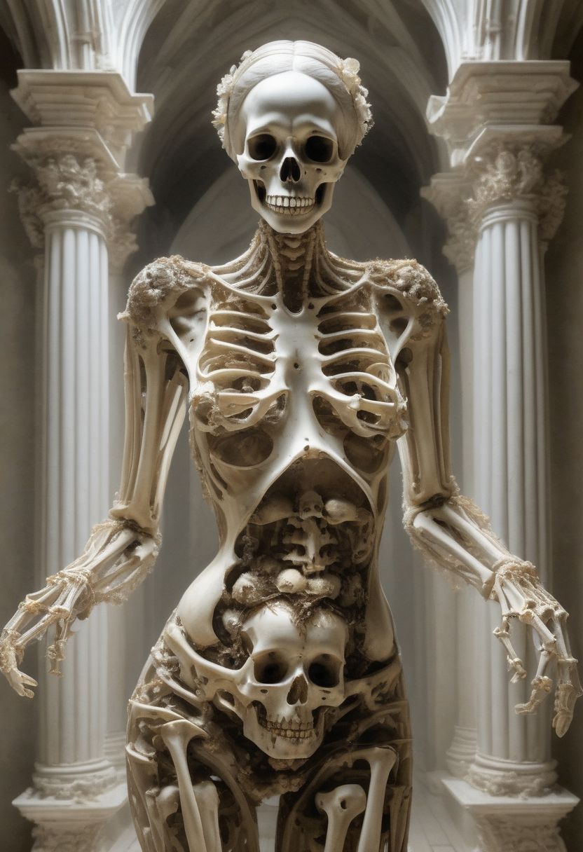 The Sedlec Ossuary style, Rembrandt Lighting Style, made of bones, detailed, ghost lady, transparrent person, sexy