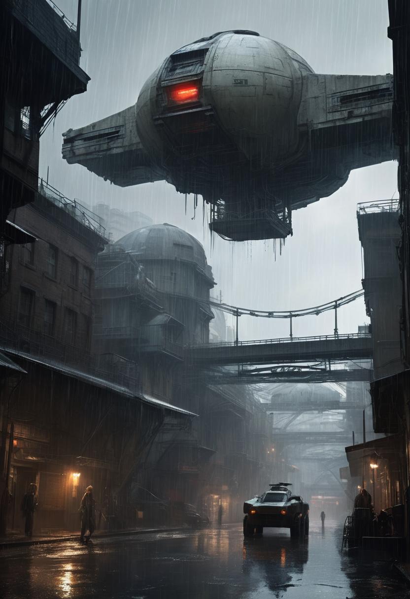 Heavy rain pummels a labyrinthine urban landscape, created by Victorian-esque structures studded with futurist technology, as a shape-shifting, mechanical hunter stalks a fleeing agent. The x-wing bridge houses her mechanical defences, set to reveal the faint glow of a potential outlier