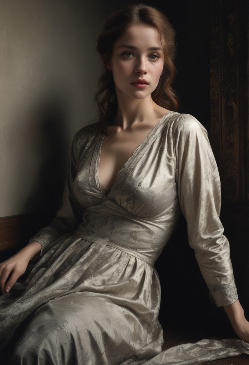 chest is covered, (Soft Lighting Photography by Mimoza Veliu and Mario Giacomelli:1.2), Ancient russia costume, chest is covered, beautiful girl, side soft light, Dark environment, black over black, highly detailed, masterful painting in the style of Anders Zorn and Aleksi Briclot, oil on canvas