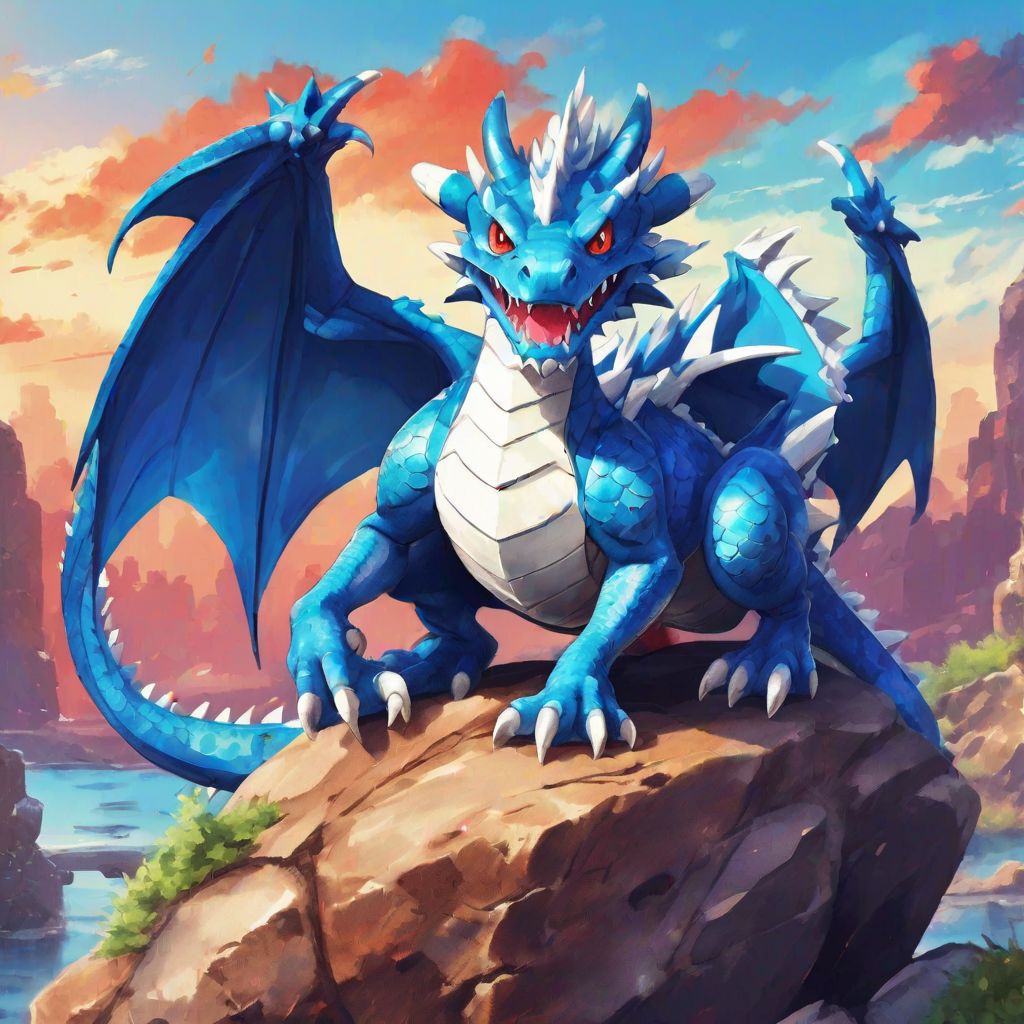 watercolor image of a blue and white dragon sitting on top of a rock, well-designed digital art, featured on dribbble, medibang, warm saturated palette, style of olidon redon, the artist has used bright, airbrush render, cartoon image, beautifully rendered, digital art - w 640, trending on artstion, red and green hour new pokemon, official art, illustration pokemon